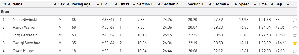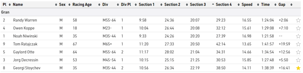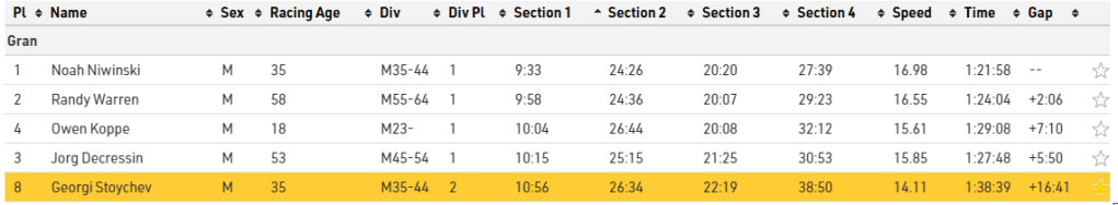 This was a full out assault effort and I was feeling hurt at the end of it. Time to recover I though as we were now halfway done and the temperature was increasing. 4th place overall on this section
