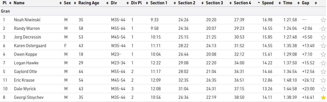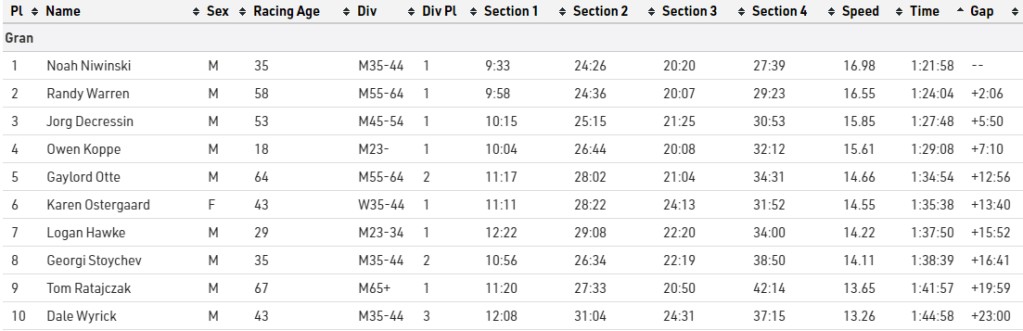 The last section felt super tough, i was having hard time keeping my hearth rate manageable and was not generating the power i wanted to. I was tired, a bit dehydrated and running hot. I did catch up to the gentleman i met at the gas station up that hill but also saw myself being overtaken by two other racers and it didn’t feel good. I was 10 minutes behind the leader and 10 minutes behind him just on this stage alone !!!