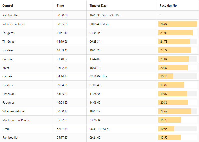 I was in peace with the reality of facing headwinds all the way to Brest. There was nothing i can do to stop it so why worry about it. I did spent too much time on the aerobars and paid for it later on. My goal was to get there as fast as possible and put some time in the bank for anything that might happen later on. Typically, I was in and out of controls within 5 minutes, just getting a stamp and filling up my 3 water bottles.